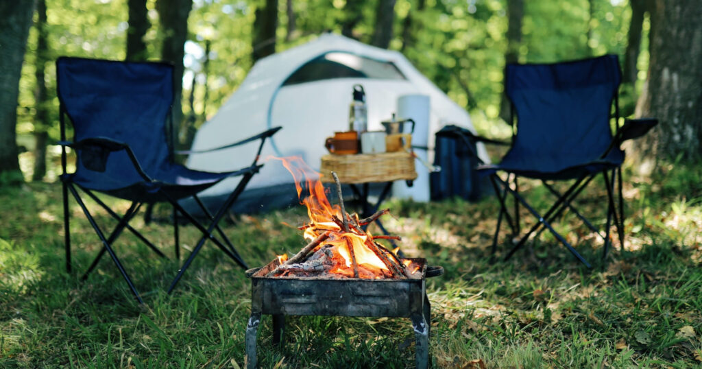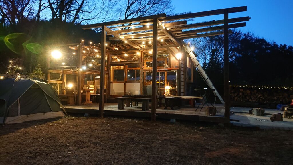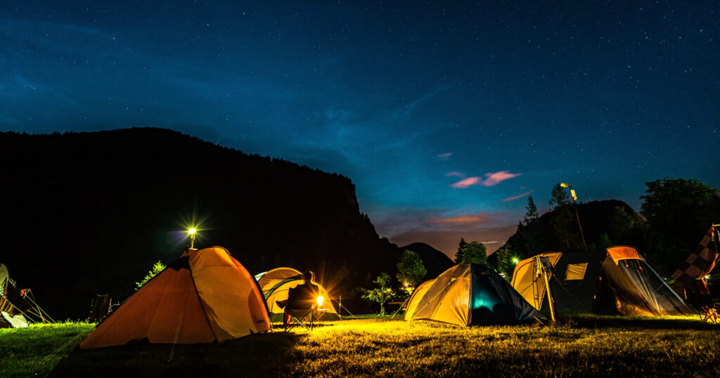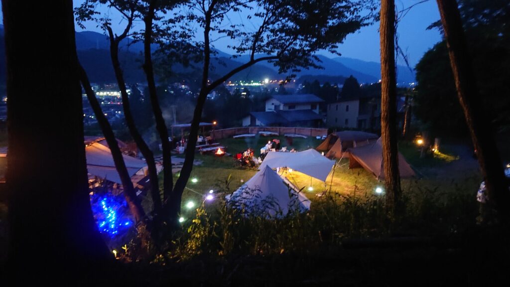 暖かな灯りがキャンプ場を照らし出し、焚き火の炎が幻想的な雰囲気を演出します。