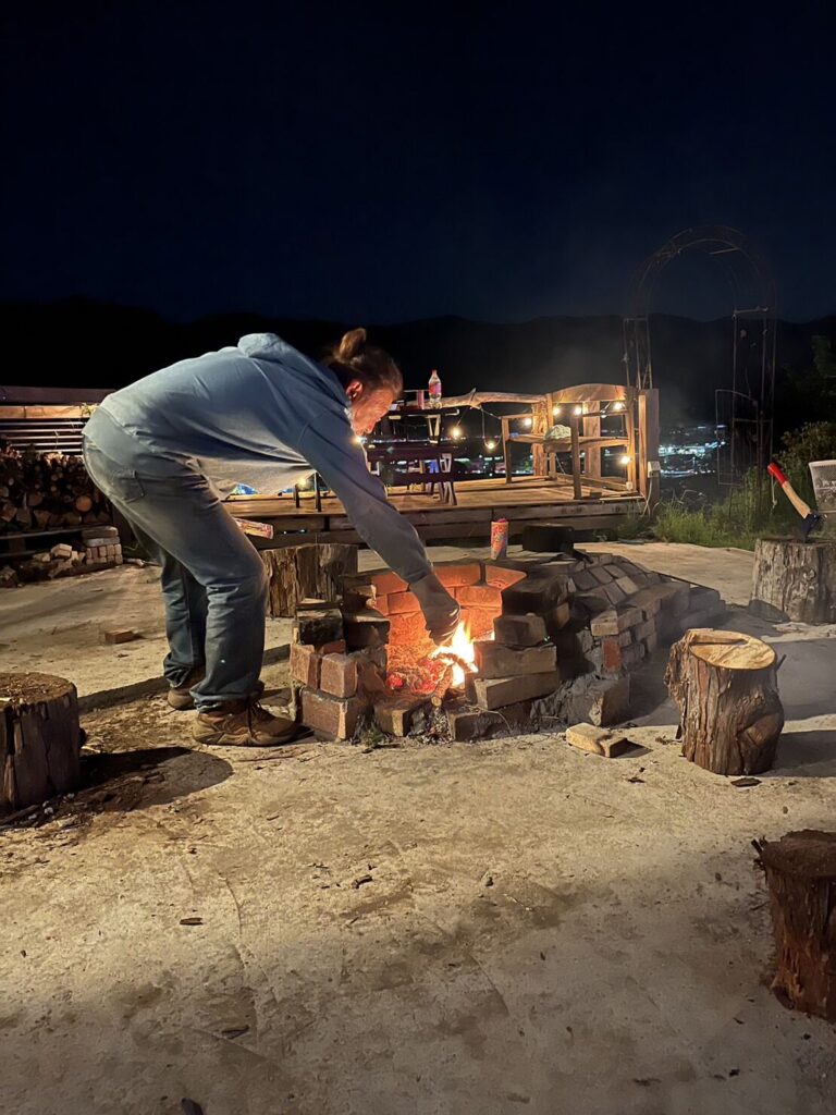 暖かな灯りがトレーラーハウスを照らし出し、焚き火の炎が幻想的な雰囲気を演出します。